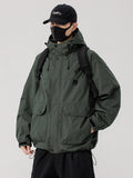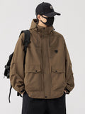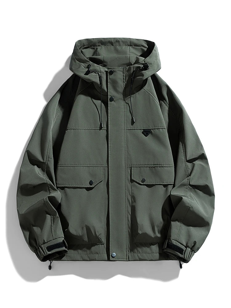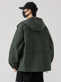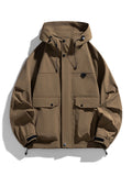Esta chaqueta cortavientos con capucha para hombre, disponible en tallas grandes, ofrece un corte holgado de estilo coreano, ideal para looks casuales de primavera y otoño. Confeccionada en poliéster resistente con un cómodo forro, cuenta con un cierre de cremallera fiable, largo estándar y cuello clásico. Disponible en negro, café y verde militar, esta chaqueta combina prácticos detalles bordados con un diseño liso. Diseñada para ofrecer comodidad y facilidad de uso, se adapta a tallas desde la 6XL hasta la 8XL e incluye una capucha para mayor protección. Ideal para quienes buscan una prenda exterior elegante y ligera que se adapte a sus movimientos con total libertad.