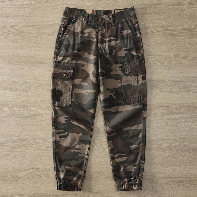 Woodland Camouflage Cuffed Cargo Joggers Master the art of tactical style with these versatile cargo joggers. Featuring authentic woodland camouflage patterning, reinforced cuffs, and strategically placed cargo pockets, they deliver both function and edge. The comfortable jogger fit moves with you whether you're navigating urban streets or outdoor adventures. Premium fabric construction ensures durability through everyday wear, while the camo aesthetic makes a bold statement. Elevate your casual wardrobe with pants that balance practicality and contemporary style.