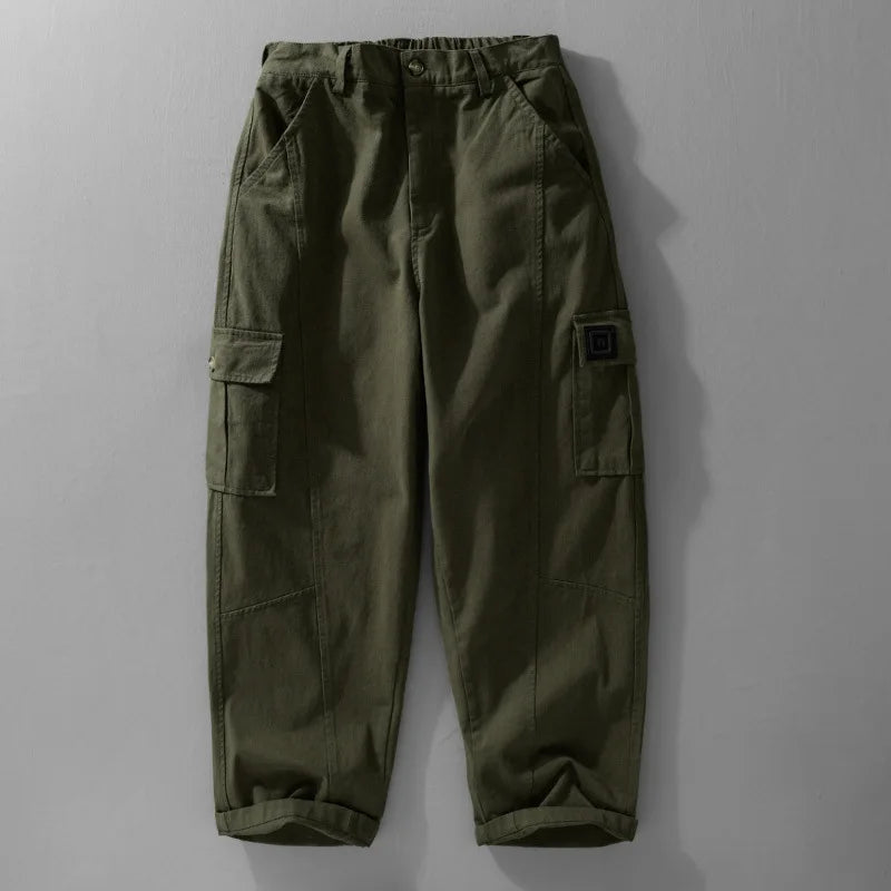 These cargo trousers are designed for a relaxed, contemporary silhouette, blending utility with street-ready style. Crafted from a durable, heavy-duty cotton twill, they feature a loose-cut leg that tapers slightly towards the ankle for a clean finish. The design incorporates classic functional elements, including spacious bellows pockets on the thighs with secure flap closures, alongside standard slanted side pockets and rear welt pockets. A reinforced waistband with sturdy belt loops ensures a reliable fit, while the subtle textured finish of the fabric adds depth to the overall aesthetic. Ideal for everyday wear, these trousers offer maximum comfort and versatility for an effortless British urban look.