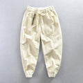 These joggers offer a tactile and sophisticated take on loungewear, combining the plush texture of traditional corduroy with a contemporary, relaxed silhouette. Crafted from a heavy-gauge cotton corduroy with a distinct wide-wale finish, the fabric provides exceptional warmth and a structured drape. The design features an exaggerated, slouchy fit through the seat and thighs, tapering sharply to elasticated cuffs at the ankle for a clean, modern finish.